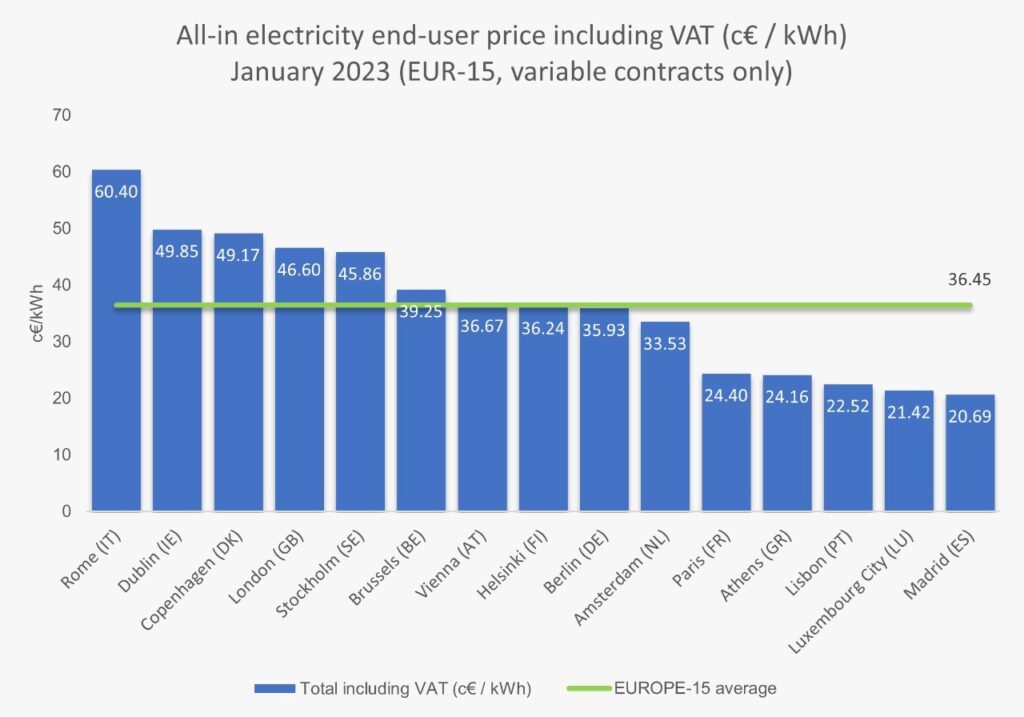 Τον Ιανουάριο στη χώρα μας η μέση τιμή της κιλοβατώρας διαμορφώθηκε στα 24,16 λεπτά, αρκετά πιο κάτω από τον ευρωπαϊκό μέσο όρο στα κυμαινόμενα τιμολόγια, ο οποίος είναι 36,45 λεπτά. Για ακόμα έναν μήνα είμαστε πολύ φθηνότεροι ακόμα κι από χώρες με ώριμες αγορές ενέργειας, όπως η Ιταλία (60,4 λεπτά), η Μεγάλη Βρετανία (46,6 λεπτά), η Γερμανία (35,93 λεπτά) κλπ.