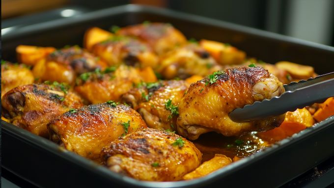 - Ρίχνουμε τη σάλτσα ομοιόμορφα πάνω από το κοτόπουλο και τις πατάτες και με ένα πινέλο αλείφουμε να πάει παντού.