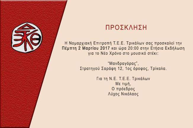 Ο πρόεδρος της Ν.Ε του ΤΕΕ Τρικάλων Νίκος Λύχος προσκαλεί τα μέλη να παραβρεθούν στην εκδήλωση που θα πραγματοποιηθεί την Πέμπτη 2 Μαρτίου στις 8 μ.μ στο μουσικό στέκι “Μανδραγόρας”