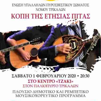 Η Ένωση Υπαλλήλων Πυροσβεστικού Σώματος Ν.Τρικαλων σας προσκαλεί στην κοπή πίτας,που θα γίνει στις 1 Φεβρουαρίου 2020 στις 8:30 στο κέντρο Τζάκι.
