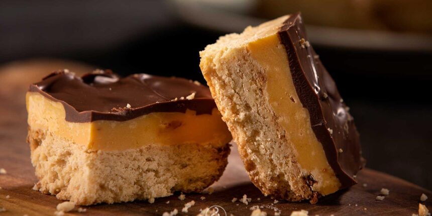 Κόβουμε τα μπισκότα µε καραμέλα μ’ ένα μαχαίρι, σε τετράγωνα μπισκότα ή σε μακρόστενα
