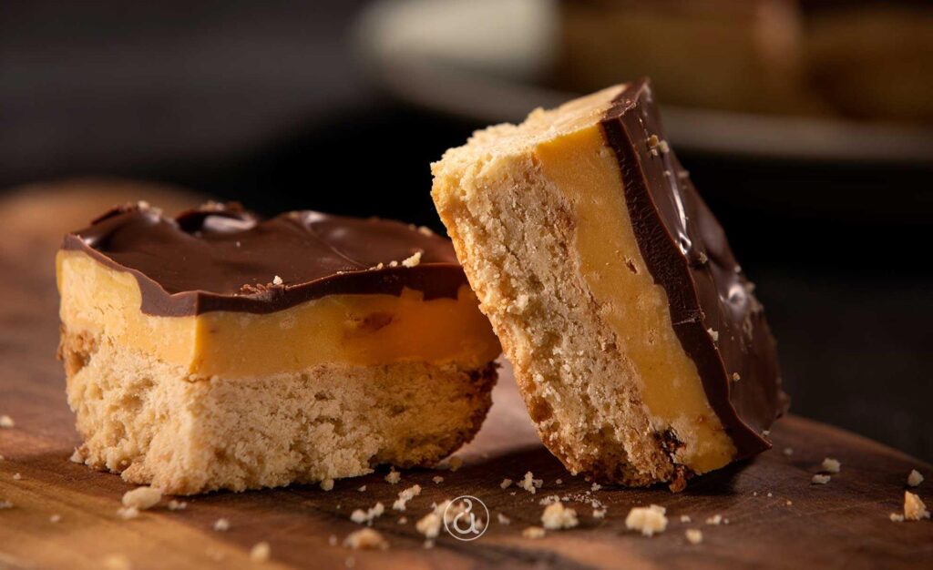 Κόβουμε τα μπισκότα µε καραμέλα μ’ ένα μαχαίρι, σε τετράγωνα μπισκότα ή σε μακρόστενα