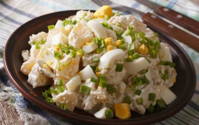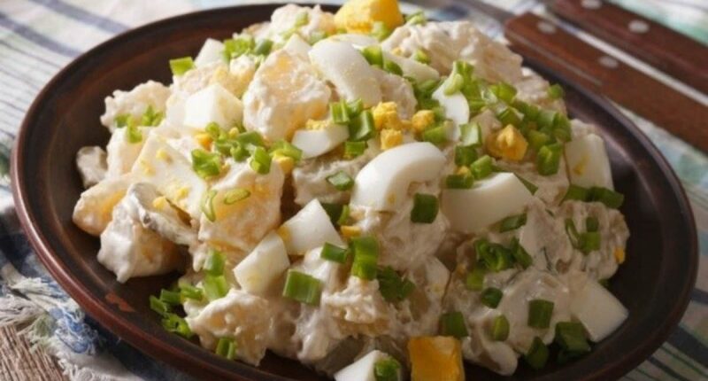 - Στραγγίζετε τις πατάτες, τις ρίχνετε κι αυτές στο μπολ, προσθέτετε τα αυγά, το κρεμμυδάκι και τον άνηθο και ανακατεύετε καλά να πάει παντού η σάλτσα. Σερβίρετε.