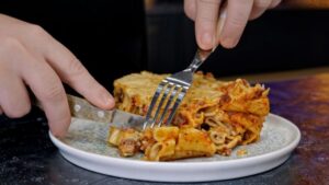 - 500 γρ. Ζυμαρικά Ριγκατόνι (βρασμένα 2 λεπτά λιγότερο από τις οδηγίες της συσκευασίας μαζί με 2 κ.σ. ελαιόλαδο)
