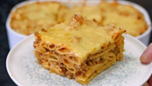 - Ρίχνουμε τα βρασμένα ζυμαρικά και ανακατεύουμε πολύ καλά να ενσωματωθεί καλά μαζί με το κιμά.