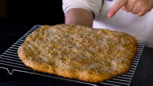 - Κάνουμε δαχτυλιές σε όλη τη ζύμη και πασπαλίζουμε μπόλικο σουσάμι.