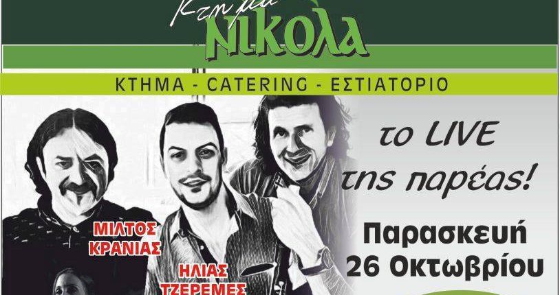 Πρόσκληση για μια ωραία βραδιά γεμάτη λαϊκή και δημοτική μουσική με ζωντανή ορχήστρα απευθύνει η ταβέρνα «Κτήμα Νικόλας» για την Παρασκευή 26 Οκτωβρίου.