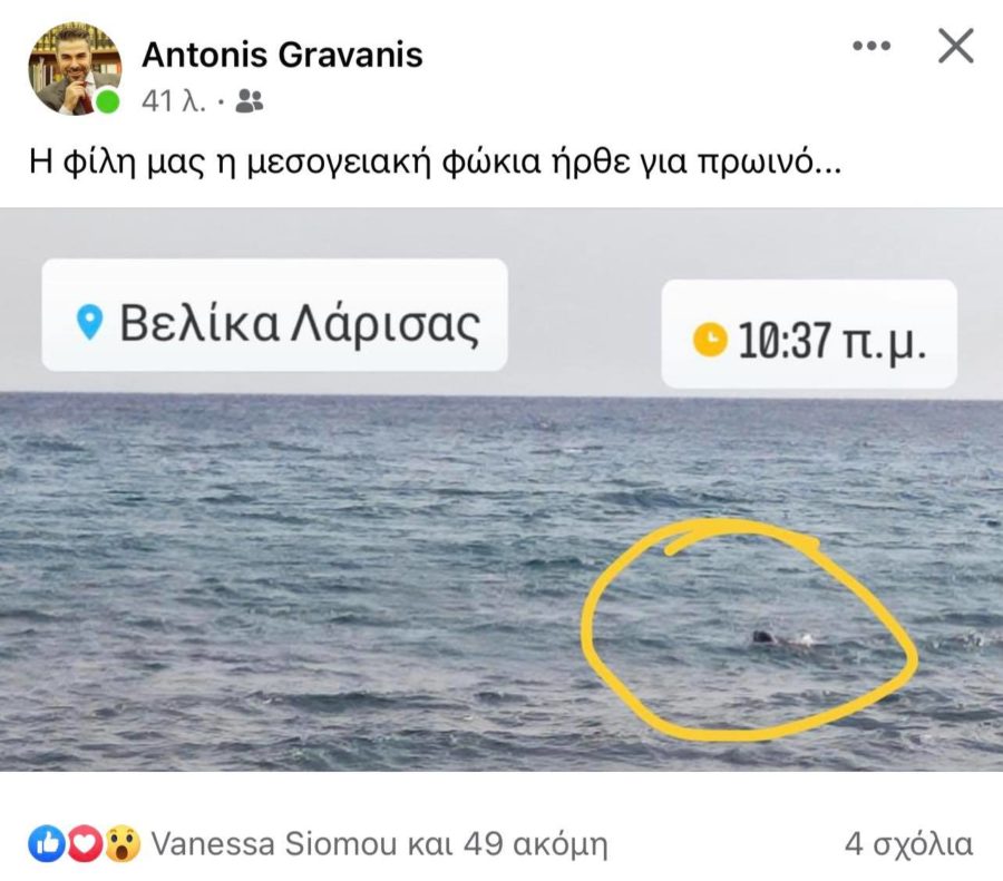 Όπως μπορείτε να διακρίνετε και στη φωτογραφία που ανάρτησε στο προσωπικό του προφίλ στο facebook ο Λαρισαίος δικηγόρος Αντώνης Γραβάνης, η φώκια έφτασε σε κοντινή απόσταση από την ακτή, με τους λουόμενους να σπεύδουν να απαθανατίσουν την εμφάνιση του συμπαθέστατου θηλαστικού.