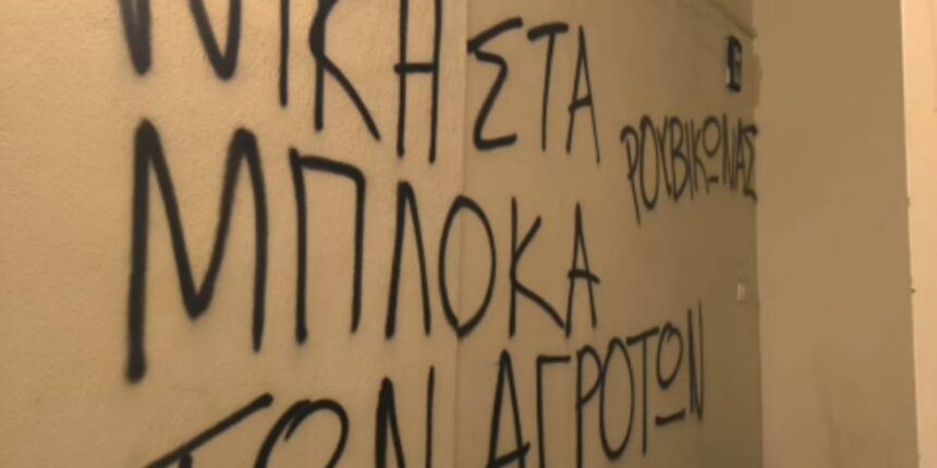 Σε βανδαλισμούς έξω από τα γραφεία της Νέας Δημοκρατίας στη Λάρισα προχώρησαν το βράδυ της Τετάρτης, μέλη του Ρουβίκωνα.