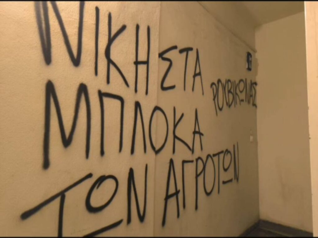 Σε βανδαλισμούς έξω από τα γραφεία της Νέας Δημοκρατίας στη Λάρισα προχώρησαν το βράδυ της Τετάρτης, μέλη του Ρουβίκωνα.