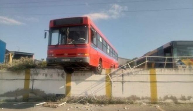 Στο κενό βρέθηκε να κρέμεται ένα λεωφορείο του ΟΑΣΘ, το οποίο δεν είχε φρένα, στο αμαξοστάσιο της Σταυρούπολης, στη Θεσσαλονίκη.