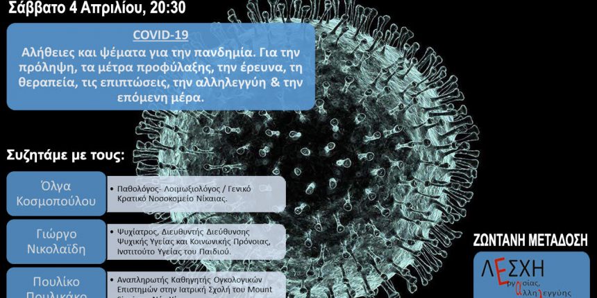 Η Λέσχη Εργασίας, Αλληλεγγύης & Πολιτισμού Τρικάλων διοργανώνει το Σάββατο 4 Απρίλη στις 8:30 μ.μ., διαδικτυακή συζήτηση σε ζωντανή μετάδοση, με θέμα: «COVID-19: αλήθειες και ψέματα για την πανδημία. Για την πρόληψη, τα μέτρα προφύλαξης, την έρευνα, τη θεραπεία, τις επιπτώσεις, την αλληλεγγύη & την επόμενη μέρα».