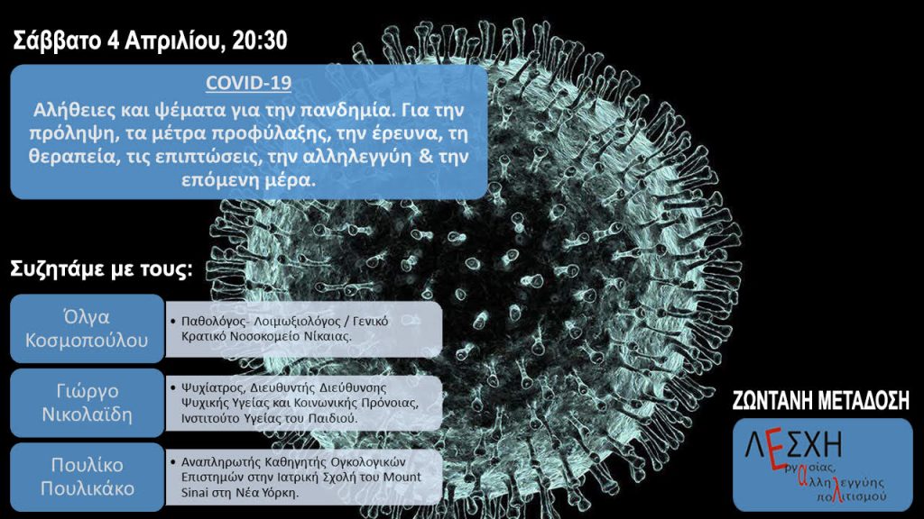 Η Λέσχη Εργασίας, Αλληλεγγύης & Πολιτισμού Τρικάλων διοργανώνει το Σάββατο 4 Απρίλη στις 8:30 μ.μ., διαδικτυακή συζήτηση σε ζωντανή μετάδοση, με θέμα: «COVID-19: αλήθειες και ψέματα για την πανδημία. Για την πρόληψη, τα μέτρα προφύλαξης, την έρευνα, τη θεραπεία, τις επιπτώσεις, την αλληλεγγύη & την επόμενη μέρα».