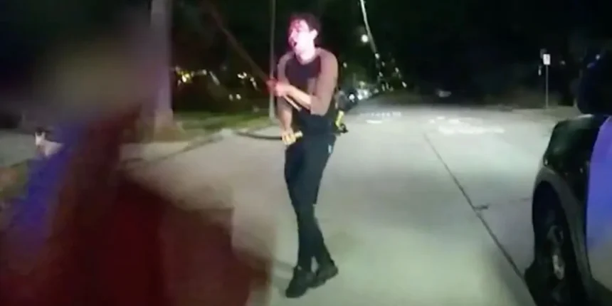 Όταν οι αστυνομικοί έφτασαν, είδαν τον Ερέρα να περπατά στη μέση του δρόμου κρατώντας δύο ξίφη και προσπάθησαν να «αποκλιμακώσουν» την κατάσταση, δείχνει το βίντεο που κυκλοφόρησε από το LAPD .
