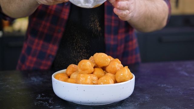 - Ρίχνουμε τους λουκουμάδες σε ένα μπολ και τους πασπαλίζουμε με μέλι και κανέλα.