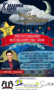 Μέσα στο παραμυθένιο Χριστουγεννιάτικο πάρκο, στο Μύλο των Ξωτικών, Η Ακαδημία Χορού Τρικάλων φοράει τα γιορτινά της και σας προσφέρει ένα μαγικό μουσικοχορευτικό show αφιερωμένο στα Χριστούγεννα! Σάββατο 17 Δεκεμβρίου λοιπόν και ώρα 19.00 η ομάδα της Ακαδημίας Χορού Τρικάλων σύσσωμη από τους πιο μικρούς ως τους πιο μεγάλους σας περιμένει να διασκεδάσετε παρέα σε ρυθμούς Latin, hiphop, oriental, parkour, breakdance, zumba, tangoargentino, salsa, αλλά και πολλά show έκπληξη! Όλα αυτά με την υπογραφή των καθηγητών της σχολής. Μάγδα Μπέττα, Μάγδα Σαμαρά, Γρηγόρης Σάκκης, Κοσμάς Καφφές, DorianTafa, Μίκα Παυλάκη, ΒάλιαΜπρίση, Λώρα Τσάρα, ΚαρατράντουΝάντια, ΣτέλλαΜπλάνα, Κλεοπάτρα Αδαμοπούλου, ΑντζελαΠηλίγκου, ΓιούλιαΠεταράκη.