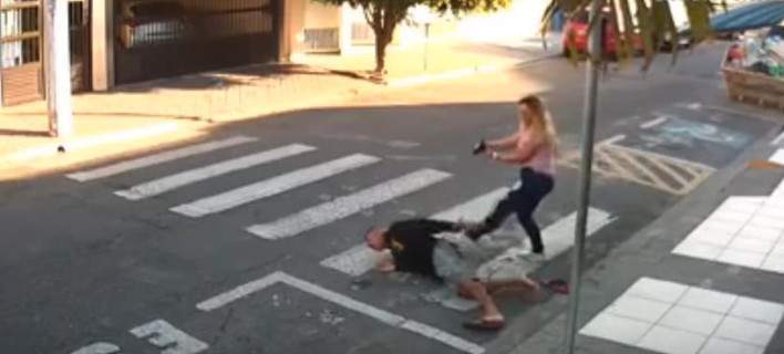 Η αστυνομικός κάνει πίσω για να βγει από τη γραμμή του πυρός και στη συνέχεια πλησιάζει τον τραυματία και κλωτσά μακριά το όπλο του, προτού το περιμαζέψει.