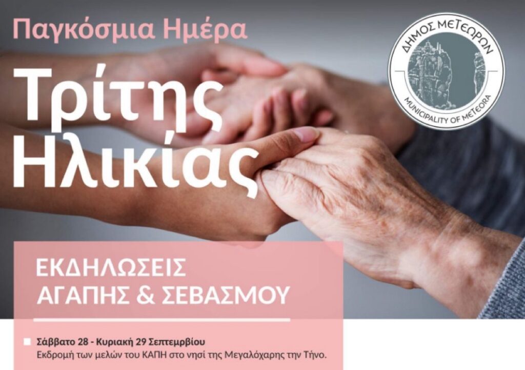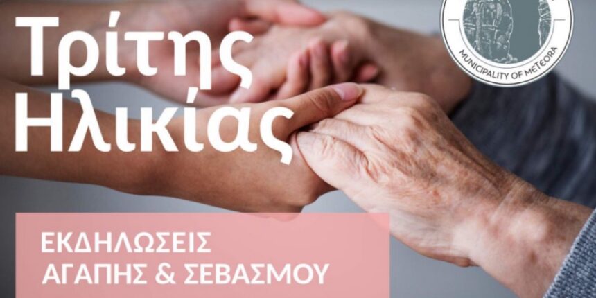 Την Παγκόσμια Ημέρα Τρίτης Ηλικίας τιμά ο Δήμος Μετεώρων. Με σεβασμό και αγάπη έχει ήδη ετοιμαστεί ένα πλούσιο πρόγραμμα εκδηλώσεων και δράσεων προκειμένου στην πράξη να τονιστεί ότι οι άνθρωποι της Τρίτης Ηλικίας, αποτελούν ένα σημαντικό ενεργό κομμάτι της κοινωνίας μας. Αναλυτικότερα το πρόγραμμα των εκδηλώσεων έχεις ως εξής:
