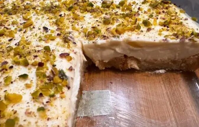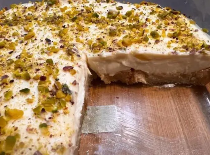 - Το αφήνουμε να κρυώσει σε θερμοκρασία δωματίου, το διακοσμούμε με φιστίκια και το βάζουμε στο ψυγείο.