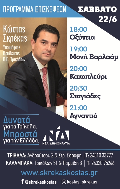 trikaladay.gr / Τοπικά / Μεγάλες συγκεντρώσεις του Κώστα Σκρέκα, σε όλα τα χωριά. Το πρόγραμμα περιοδείας για το Σάββατο 22/6