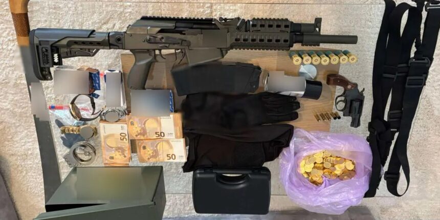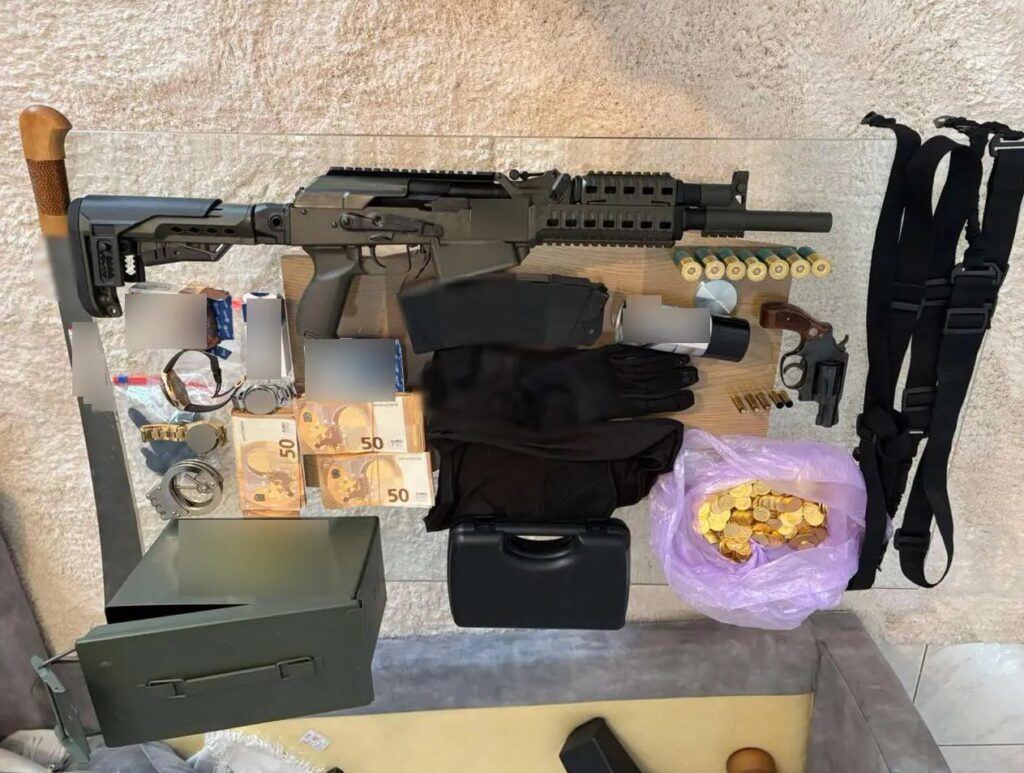 Κατά τις έρευνες που πραγματοποιήθηκαν στις οικίες των κατηγορουμένων εντοπίστηκαν και κατασχέθηκαν πλήθος αντικειμένων, μεταξύ των οποίων 52.930 ευρώ σε μετρητά, 2.267 λίρες αμφιβόλου γνησιότητας, 14 πολυτελή οχήματα και ακόμη ένα κλεμμένο, πέντε όπλα –περίστροφο, λυόκανο τυφέκιο, υποπολυβόλο, καραμπίνα και αεροβόλο πιστόλι– καθώς και πλήθος φυσιγγίων και γεμιστήρων. Επιπλέον βρέθηκαν επτά ρολόγια, χρυσές αλυσίδες, δαχτυλίδια, σταυροί, μενταγιόν και τσάντες, ναρκωτικά και αναβολικά χάπια, αμπούλες αναβολικών ουσιών, κάμερες, καταγραφικά, συσκευή γεωεντοπισμού, φορητός υπολογιστής και δώδεκα κινητά τηλέφωνα.
