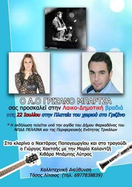 Για δεύτερη συνεχόμενη χρονιά η ποδοσφαιρική ομάδα του χωριού ΑΟ Γριζάνο Μπάρτσα διοργανώνει λαϊκοδημοτική βραδιά.