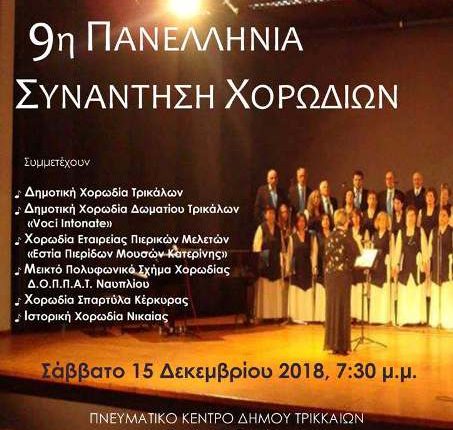Μια ακόμη μεγάλη μουσική – χορωδιακή γιορτή διοργανώνεται από τον Δήμο Τρικκαίων. Πρόκειται για την 9η Πανελλήνια Συνάντηση Χορωδιών, που θα πραγματοποιηθεί το Σάββατο 15 Δεκεμβρίου 2018 στις 7:30μ.μ. στο Πνευματικό Κέντρο τού Δήμου Τρικκαίων «Αθανάσιος Τριγώνης», στην αίθουσα «Δημήτρης Καβράκος».