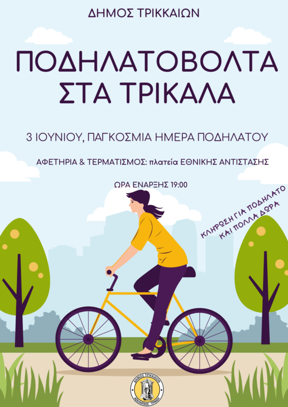 Την Παγκόσμια Ημέρα Ποδηλάτου γιορτάζει με μεγάλη ποδηλατοβόλτα ο Δήμος Τρικκαίων. Στην πόλη με τα πάνω από 40.000 ποδήλατα και τους συνεχώς αυξανόμενους ποδηλατοδρόμους, οι ποδηλάτες και οι ποδηλάτισσες συγκεντρώνονται την Τρίτη 3 Ιουνίου 2025, ανήμερα της Παγκόσμιας Ημέρας, στις 19:00, στην πλατεία Εθνικής Αντίστασης. Από εκεί θα ξεκινήσει μια όμορφη βόλτα, με ασφάλεια και προστασία για όλες τις ηλικίες. Η διαδρομή είναι 10 χιλιόμετρα και θα ακολουθήσει την πορεία: Πλατεία Εθνικής Αντίστασης – οδός Ιακωβάκη – (δεξιά) γέφυρα Γκίκα – αριστερά αμέσως μετά τη γέφυρα – πίσω από το μουσείο Τσιτσάνη – (ευθεία) οδός Δαβάκη – αριστερά στην οδό Τερτίπη – δεξιά στην οδό Καλυψούς – αριστερά γέφυρα Αρριανού – δεξιά οδός Λέσβου – ευθεία στη γέφυρα Καρδίτσης απέναντι στην οδό Σκοπέλου – ευθεία προς Καρυές – Φλαμούλι – μετά τις γραμμές δεξιά και ευθεία στην οδό Λάμπρου Παπαβασίλη – οδός Βησσαρίωνος, απέναντι οδός Νεραιδοχωρίου (δίπλα από Χάνι) αριστερά από γραμμές – Μετεώρων – δεξιά στην επαρχιακή οδό Τρικάλων – Περιστέρας – δεξιά οδός Καλαμπάκας πάνω στον ποδηλατόδρομο – οδός Ηπείρου – μετά τη Γέφυρα στο Μαιευτήριο δεξιά στην οδό Αμαλίας (ποδηλατόδρομος) – τερματισμός στην Πλατεία Εθνικής Αντίστασης.