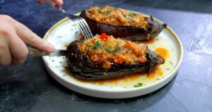 - Βγάζουμε τις μελιτζάνες από τον φούρνο και πατάμε στην μέση με ένα πηρούνι για να δημιουργηθεί μια θήκη.