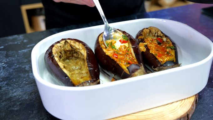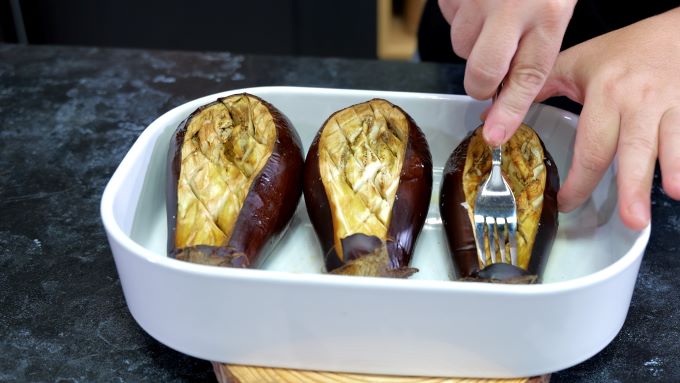 - Βγάζουμε τις μελιτζάνες από τον φούρνο και πατάμε στην μέση με ένα πηρούνι για να δημιουργηθεί μια θήκη.