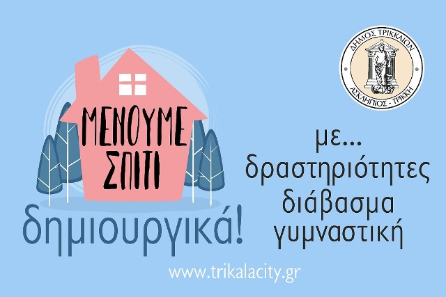 Στην ιστοσελίδα του Δήμου trikalacity.gr «στήθηκε» ειδικός χώρος με τον τίτλο «Μένουμε Σπίτι Δημιουργικά» (στον σύνδεσμο https://trikalacity.gr/menoyme-spiti-dimioyrgika/). Εκεί, σε χωριστές ενότητες, ο γονιός και το παιδί μπορούν να βρουν παραμύθια, δημιουργικά παιχνίδια, προτάσεις για διάβασμα, μάθημα επιστήμης, γυμναστική για το σπίτι και πολλές δραστηριότητες.