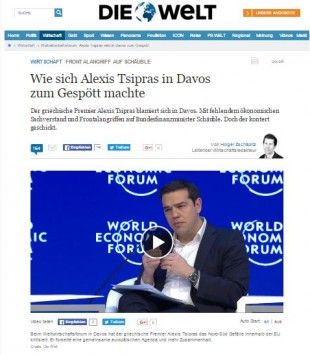 Η γερμανική εφημερίδα αναφερόταν στην παρουσία του Αλέξη Τσίπρα στο Νταβό με τα χειρότερα λόγια και με τίτλο: “Πως ο Αλέξης Τσίπρας έγινε περίγελως στο Νταβός”. Μάλιστα, αναφέρει πως ο Έλληνας πρωθυπουργός εξετέθη με τις λιγοστές γνώσεις του για τα οικονομικά και για το γεγονός πως δεν τα κατανοούσε, σημειώνει πως ο κ. Τσίπρας προσπάθησε να επιτεθεί στον κ. Σόιμπλε ο οποίος επιδέξια πέρασε στην αντεπίθεση.