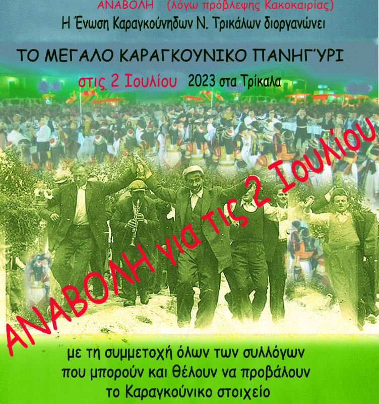 Αναβάλλεται εξαιτίας των άστατων καιρικών συνθηκών που αναμένεται να επικρατήσουν την Κυριακή το «Μεγάλο Καραγκούνικο Πανηγύρι», που διοργανώνει η Ένωση Καραγκούνηδων Ν. Τρικάλων.