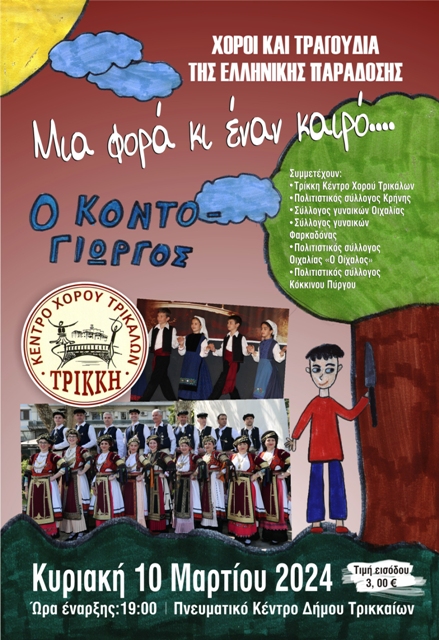 Καλημέρα σας. Την Κυριακή 10 Μαρτίου 2024 , και ώρα 19:00 στην αίθουσα εκδηλώσεων του Πνευματικού Κέντρου του Δήμου Τρικκαίων , η «ΤΡΙΚΚΗ» Κέντρο Χορού Τρικάλων θα πραγματοποιήσει μουσικοχορευτική εκδήλωση «Μια φορά και ένα καιρό… ο κοντο-Γιώργος.. » Στην εκδήλωση αυτή η συνάντηση του χορού με την μουσική και το τραγούδι μέσα από το παραμύθι θα ταξιδέψει τον θεατή σε διάφορα μέρη της Ελλάδας.