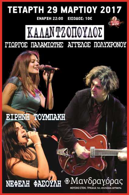 Ο Παναγιώτης Καλαντζόπουλος από τα 90’s έως σήμερα, έγραψε μερικά από τα πιο μεστά κομμάτια της εποχής μας: «Με τα Μάτια Κλειστά», «Λευκό μου Γιασεμί», “Summertime in Prague”…H Eιρήνη Τουμπάκη φωνή θερμή και λαϊκή, η Νεφέλη Φασούλη φωνή, γοητευτική και διάφανη τραγουδάνε «Το Τέλειο Έγκλημα», «Τώρα πιά είν’ αργά» «Τ’ αρσενικό», «Aγαπάτε Απατάτε» «He Loves me Loves me Not»…Σε αυτό το σχήμα, ο Παναγιώτης Καλαντζόπουλος Γιωργος Παλαμιώτης στο μπάσο, και ο Αγγελος Πολυχρόνου στα κρουστά παρουσιάζουν καινούργια τραγούδια και ορχηστρικά μερικά από τα οποία έχουν γραφτεί πάνω σε μονόστηλα εφημερίδων Τραγωδίες τραγούδια – Δράματα για Κλάμματα.