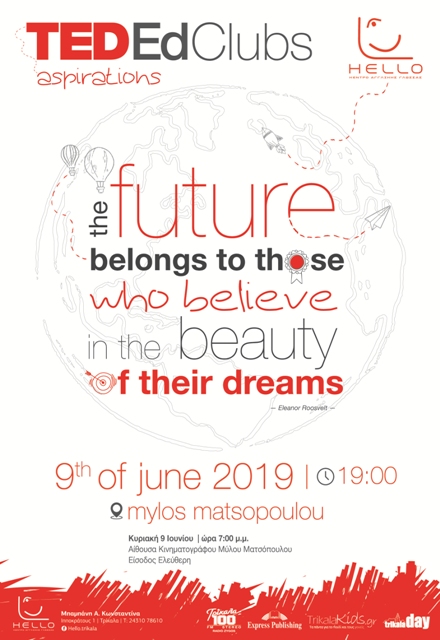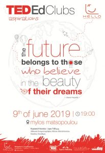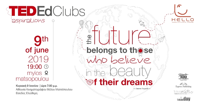 Οι μαθητές του σας προσκαλούν την Κυριακή 9 Ιουνίου στις 7:00 μ.μ. στην αίθουσα του κινηματογράφου στον Μύλο Ματσόπουλου σε μια γιορτή για εφήβους όπου και θα γίνει η επίσημη παρουσίαση των TED -Ed ομιλιών τους με θέμα ‘ASPIRATIONS’.