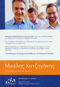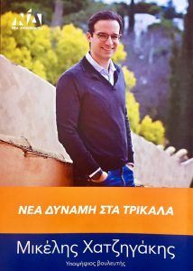 «Νέα δύναμη στα Τρίκαλα» είναι το κεντρικό σύνθημα του Μικέλη Χατζηγάκη, όπως αποτυπώνεται και στο φυλλάδιό του που κυκλοφόρησε ευθύς με την επίσημη ανακοίνωση της υποψηφιότητάς του, καθώς είναι: