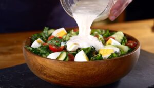 - Σε ένα μπολάκι ρίχνουμε το γιαούρτι, τη μαγιονέζα, το χυμό λεμόνι, το ελαιόλαδο και ανακατεύουμε πολύ καλά.