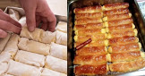 – Κλείνουμε όπως τις φλογέρες, βουτυρώνουμε καλά τα γαλακτομπουρεκάκια από πάνω και αραδιάζουμε σε βουτυρωμένο ταψί.