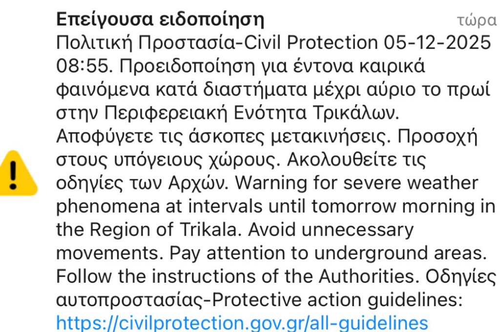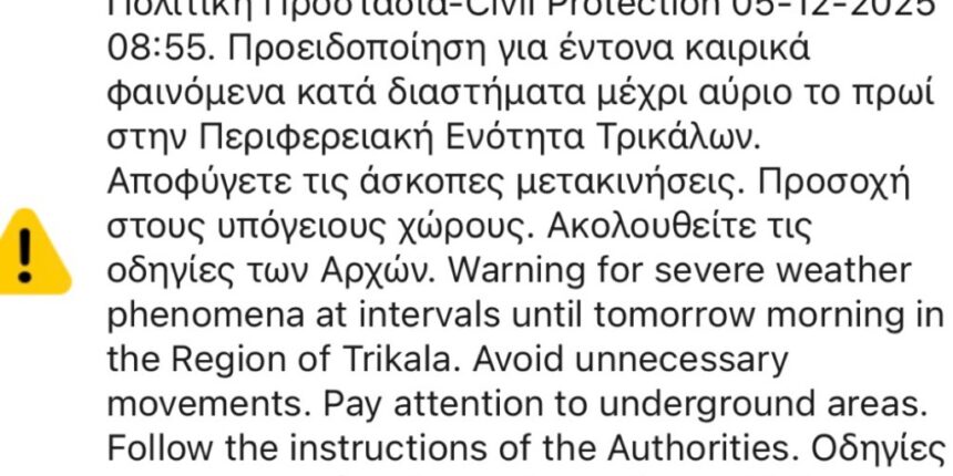 Μήνυμα του 112 στους πολίτες της Π.Ε Τρικάλων για την κακοκαιρία Κωνσταντίνος Καραποστόλης 05/12/2025 09:30 1 Εμφανίσεις Μήνυμα από το 112 δέχτηκαν οι πολίτες της Π.Ε Τρικάλων για έντονα καιρικά φαινόμενα κατά διαστήματα μέχρι το πρωί του Σαββάτου 6 Δεκεμβρίου. Post Views: 10 2025-12-05 Κωνσταντίνος Καραποστόλης Μοιράσου το Facebook Twitter