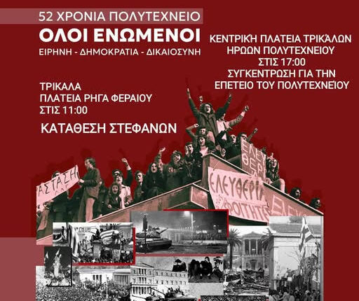 52 χρόνια μετά, το Πολυτεχνείο ζει! Όλοι εμείς κρατάμε τη φλόγα της εξέγερσης ζωντανή επιμένοντας να προστατεύουμε την ιστορική μνήμη και να τιμούμε τους αγωνιστές του Πολυτεχνείου, όπως και τη θυσία των φοιτητών και των δημοκρατικών πολιτών, που έπεσαν νεκροί από τη δικτατορία τις μέρες του ξεσηκωμού. Τιμούμε όλους τους αγωνιστές, τους φυλακισμένους και τους βασανισμένους από τη χούντα, όπως και κάθε άνθρωπο που ύψωσε το ανάστημά του και συνέβαλε με τον δικό του τρόπο στον αγώνα τα μαύρα χρόνια της επταετίας.