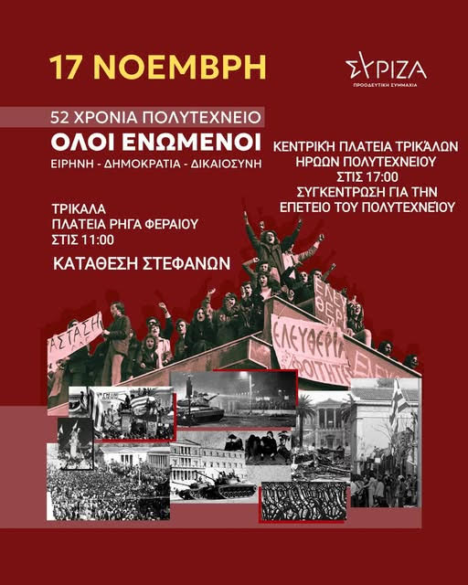 Καλούμε της νεολαία και όλους τους δημοκρατικούς πολίτες, να συμμετάσχουν μαζικά στις επετειακές εκδηλώσεις της 17ης Νοέμβρη, τις συγκεντρώσεις και τις πορείες που θα γίνουν σε όλες τις πόλεις της χώρας.