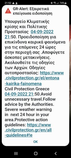 Μήνυμα του 112 για επικύνδυνα καιρικά φαινόμενα τις επόμενες 24 ώρες, από την Πολτική Προστασία, έφτασε στα κινητά πολλών Τρικαλινών