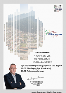 Το Σάββατο 18 Μαΐου 2019 περιόδευσε στα χωριά της ορεινής Πατρίδας και συγκεκριμένα στο Μοσχόφυτο, στο Πολυνέρι και Βαλκάνο, στο Μυρόφυλλο, στην Κορυφή, στη Νεράιδα και Λαφίνα, στον Αετό και Παχτούρι, στο Αρματωλικό, στη Μεσοχώρα, στη Νέα Πεύκη και Βαθύρρευμα. Έτυχε θερμής υποδοχής, όπου συνομίλησε με τους κατοίκους και έγινε αποδέκτης των ανησυχιών τους και των προβλημάτων που αντιμετωπίζουν.