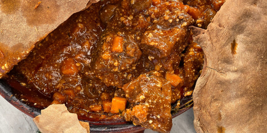- Αφαιρούμε το πήλινο απ’το φούρνο και με προσοχή με κάποιο εργαλείο μαγειρικής ξεκολλάμε τη ζύμη από τα τοιχώματα και την αποσύρουμε. Αφήνουμε για 5 λεπτά και σερβίρουμε.
