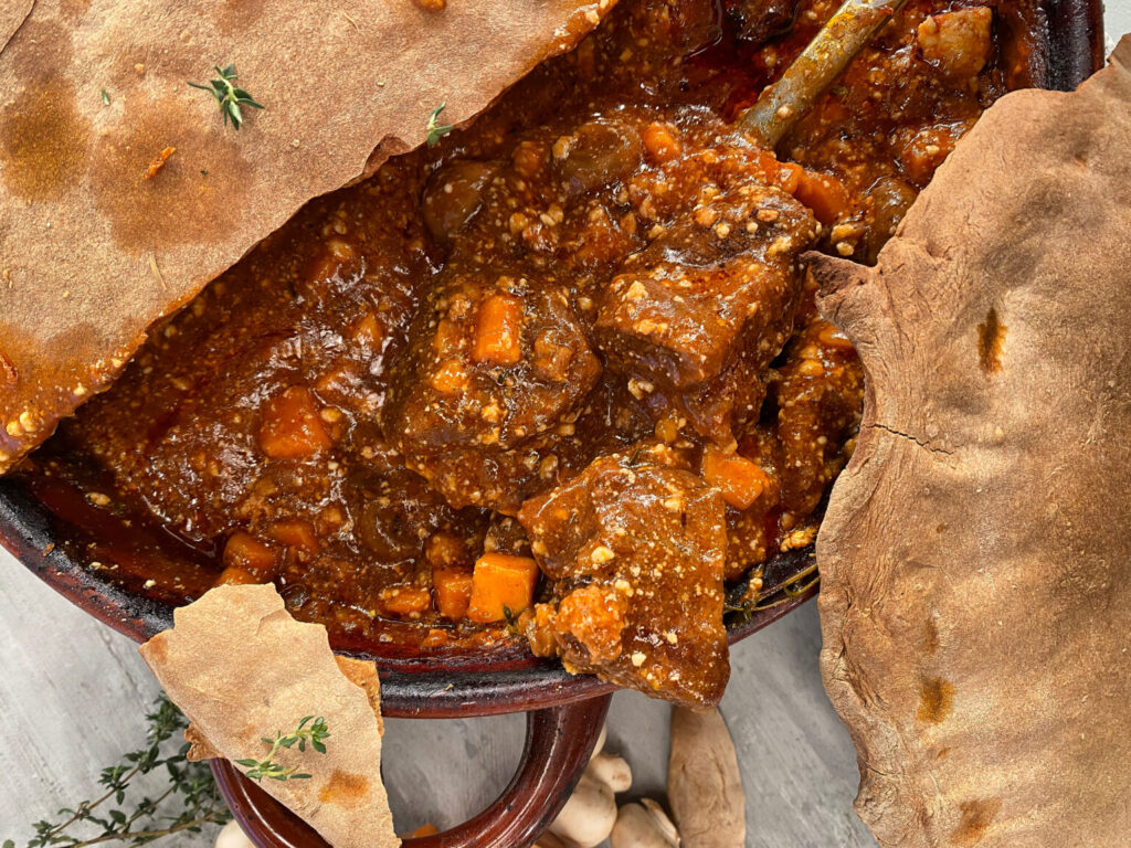 - Αφαιρούμε το πήλινο απ’το φούρνο και με προσοχή με κάποιο εργαλείο μαγειρικής ξεκολλάμε τη ζύμη από τα τοιχώματα και την αποσύρουμε. Αφήνουμε για 5 λεπτά και σερβίρουμε.