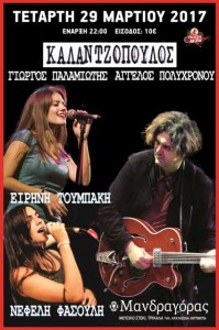Ο Παναγιώτης Καλαντζόπουλος Από τα 90’s έως σήμερα, έγραψε μερικά από τα πιο μεστά κομμάτια της εποχής μας: «Με τα Μάτια Κλειστά», «Λευκό μου Γιασεμί», “Summertime in Prague”…H Eιρήνη Τουμπάκη φωνή θερμή και λαϊκή, η Νεφέλη Φασούλη φωνή, γοητευτική και διάφανη τραγουδάνε «Το Τέλειο Έγκλημα», «Τώρα πιά είν’ αργά» «Τ’ αρσενικό», «Aγαπάτε Απατάτε» «He Loves me Loves me Not»…Σε αυτό το σχήμα, ο Παναγιώτης Καλαντζόπουλος Γιωργος Παλαμιώτης στο μπάσο, και ο Αγγελος Πολυχρόνου στα κρουστά παρουσιάζουν καινούργια τραγούδια και ορχηστρικά μερικά από τα οποία έχουν γραφτεί πάνω σε μονόστηλα εφημερίδων Τραγωδίες τραγούδια – Δράματα για Κλάμματα…