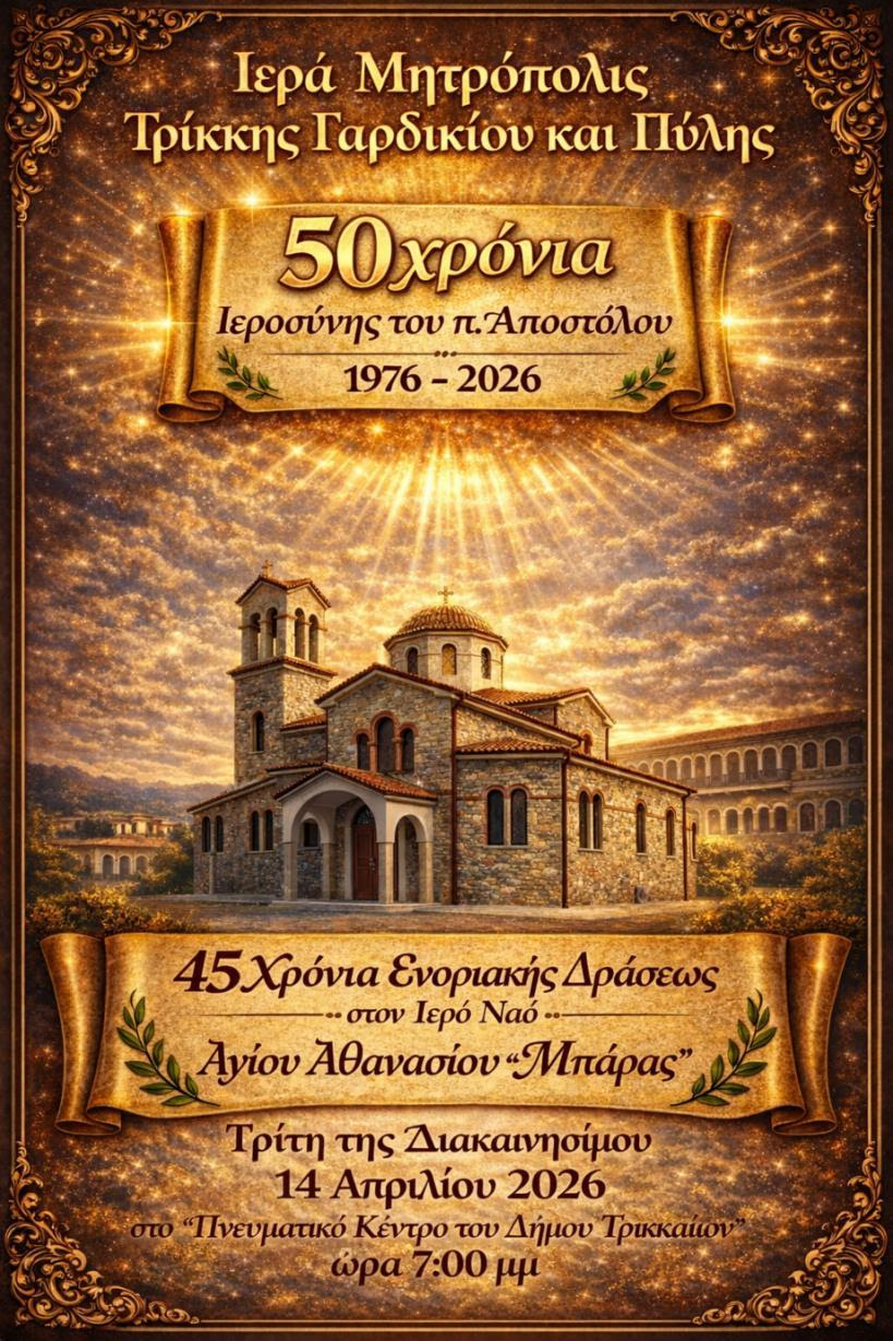 Ο Τομέας Νεότητας του Ιερού Ναού Αγίου Αθανασίου Μπάρας, διοργανώνει Μουσικοθεατρική Εκδήλωση Αφιέρωμα με τίτλο “50 Χρόνια Ιεροσύνης και 45 Χρόνια ενοριακής δράσεως του π. Αποστόλου Μανώλη!” την Τρίτη της Διακαινησίμου 14 Απριλίου 2026 στις 7:00 το βράδυ στην αίθουσα «Δημήτριος Καβράκος» του Πνευματικού Κέντρου του Δήμου Τρικκαίων «Αθανάσιος Τριγώνης» (οδός Γαριβάλδη 8).