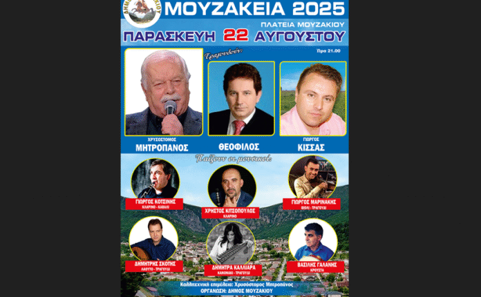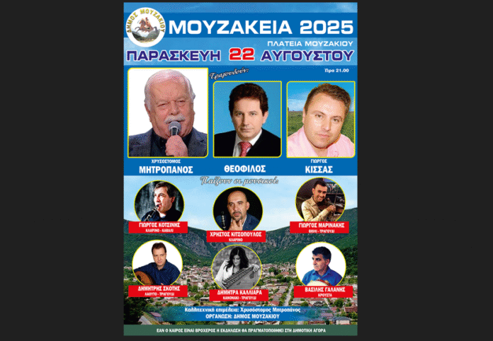 Ο Δήμος Μουζακίου σε συνεργασία με τον Αρχαιολογικό, Λαογραφικό, Πολιτιστικό Σύλλογο Μουζακίου «Οι Γόμφοι», διοργανώνουν τα καθιερωμένα ΜΟΥΖΑΚΕΙΑ 2025, που θα πραγματοποιηθούν την Παρασκευή 22 Αυγούστου 2025 και ώρα 21:00 στην κεντρική πλατεία Μουζακίου.