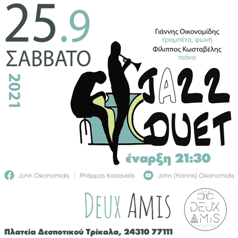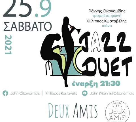 Οι Γιάννης Οικονομίδης (τρομπέτα, φλικόρνο, φωνή) και ο Φίλιππος Κωσταβέλης (πιάνο), με πολύχρονη παρουσία στα μουσικά δρώμενα της Θεσσαλονίκης και όχι μόνο, παρουσιάζουν αυτό το Σάββατο 25/9 στο DeuxAmis στην πλατεία Δεσποτικού ένα αφιέρωμα στις μεγάλες στιγμές της Jazzμουσικής.